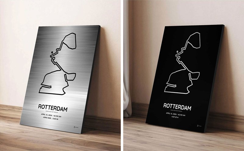 Premium Rotterdam Marathon prints on 3 mm brushed aluminum dibond. The metallic silver background creates a modern and professional look, making the Rotterdam Marathon course stand out beautifully.