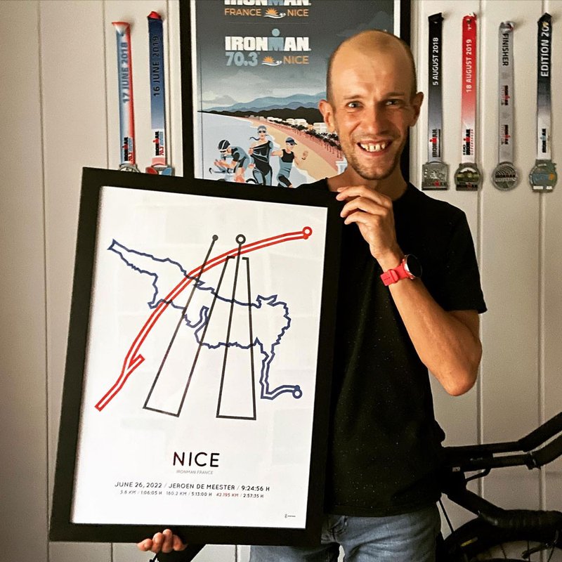 I can't remember exactly how I came across Sportymaps, probably through social media. What I do know is that after my first Ironman in 2018, in Maastricht, I was looking for something lasting. A tangible memory to hold on to. At the time, I could never have imagined that eight years later, my living room would be filled with Sportymaps! There are now thirteen, one for each Ironman, and there will undoubtedly be many more to come. Triathlon has become more than just a sport.